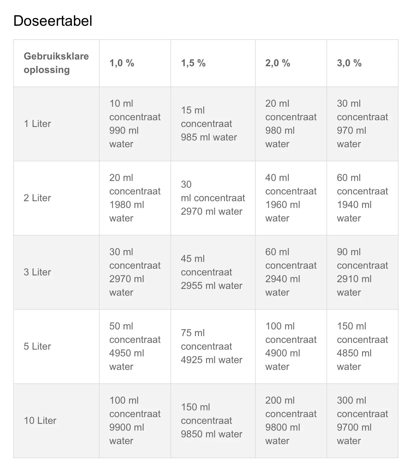 - Gebruiksconcentratie: 1% (10ml per 1000ml water) | 2% (20ml per 1000ml water)